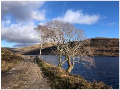 Parking beside the Callup River, near Glenfinnan, we set off along the gravel road towards Loch Shiel in cold but very still conditions to be blessed with the stunning view over the loch towards Glenfinnan viaduct, the reflections were spectacular. There followed about 12 miles of superb gravel road down the side of Loch Shiel to the hamlet of Polloch, with stunning scenery and reflections all the way, most enjoyable even though we were in the shade and the temperature never rose above -2C. Steve had left us after a few miles to head back over to Nevis Range and the MTB trails. Turning back “inland” we passed by the side of Loch Doillean being lulled into a false sense of security before the big climb through the forest kicked in. With bits as steep as 25% even I, on an ebike, had to stop a few times to recover but still got to the top before Dan and Chris, much respect to both of them for making it up that hill. 925ft in 2.7 miles! There follows a great 3 mile descent into Strontian on a super, sweeping, well surfaced road, as a “bloke” it is necessary to keep your eyes on the road (speed) which means you don’t get to look at the mines where the element Strontium was discovered and first mined.